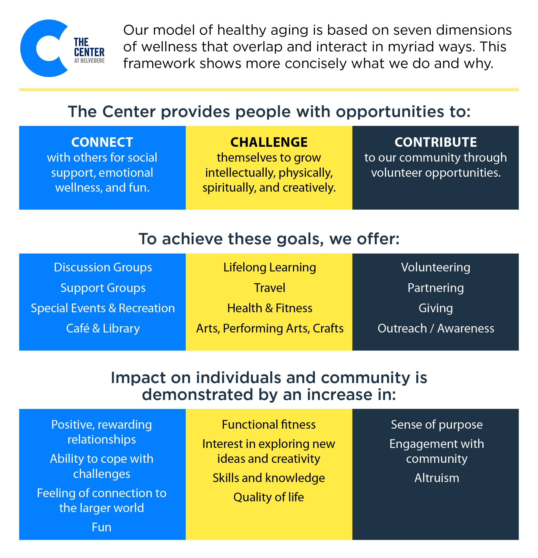 The Center is a nationally-accredited, award-winning nonprofit organization that creates opportunities for healthy aging through social engagement, physical well-being, civic involvement, creativity, and lifelong learning. With opportunities for good health, seniors increase their social and economic participation in our community while reducing healthcare costs. Since opening in 1960 (originally as the Senior Center), we have never stopped growing and evolving meet the changing needs of older adults, becoming along the way a national model for senior health and independence.